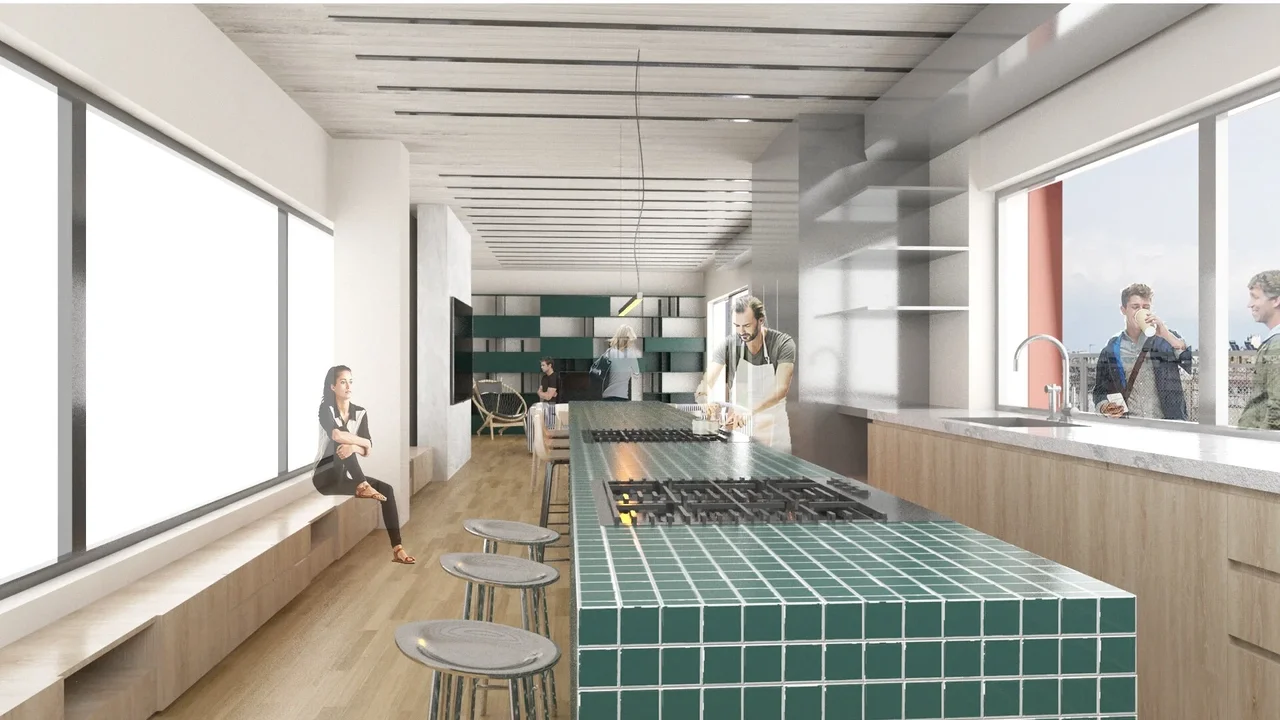 The client requested an interior design for a cafe in a residential area in london. The cafe is on the ground floor of a brick building under renovation. The look and feel requested were a bright and uplifting feel using primary colors. The design concept is based on freeing up the central space of the cafe in order to allow for different configurations as well as using brightly colored tables while leaving the chair translucent mixing a feeling of curiosity with a refined but pop of red. The walls are half painted with a powder blue which match the facade louvres therefore creating a playful feel. The bar is at the back and flanked by a wc and a storage area.