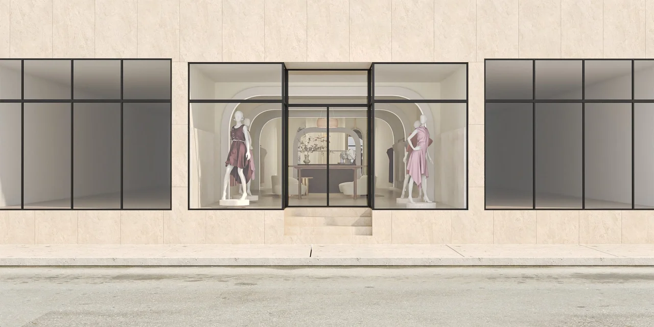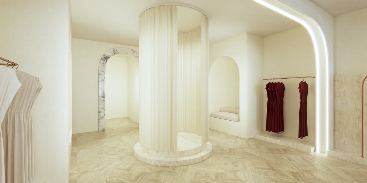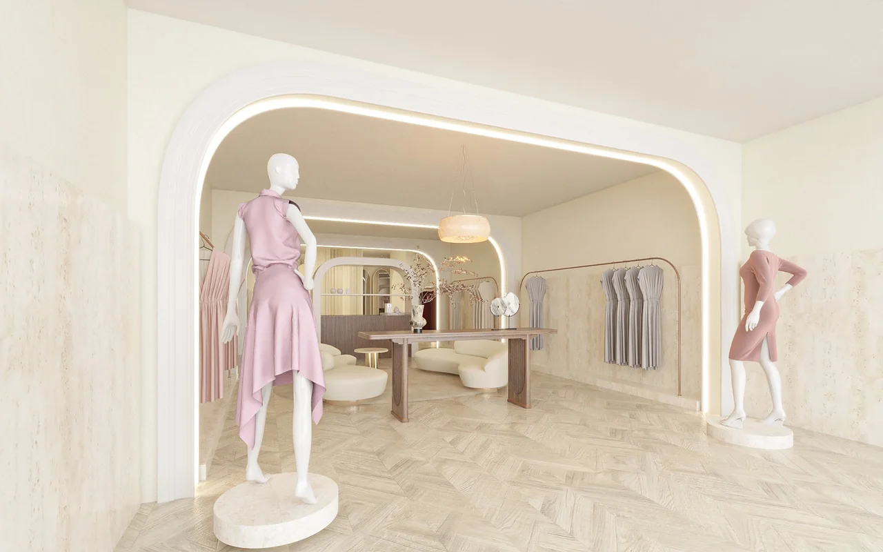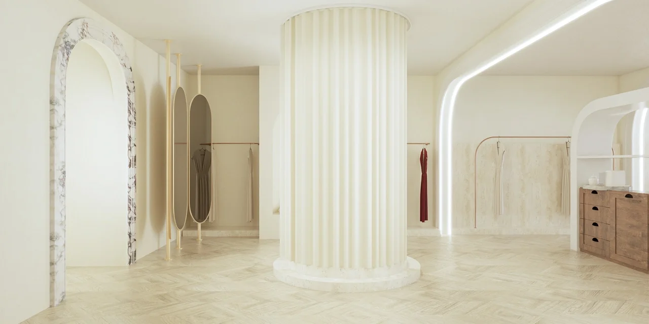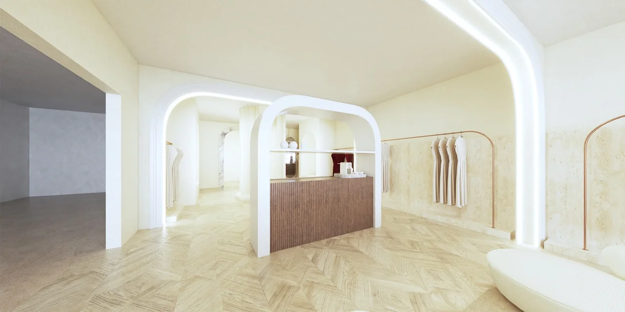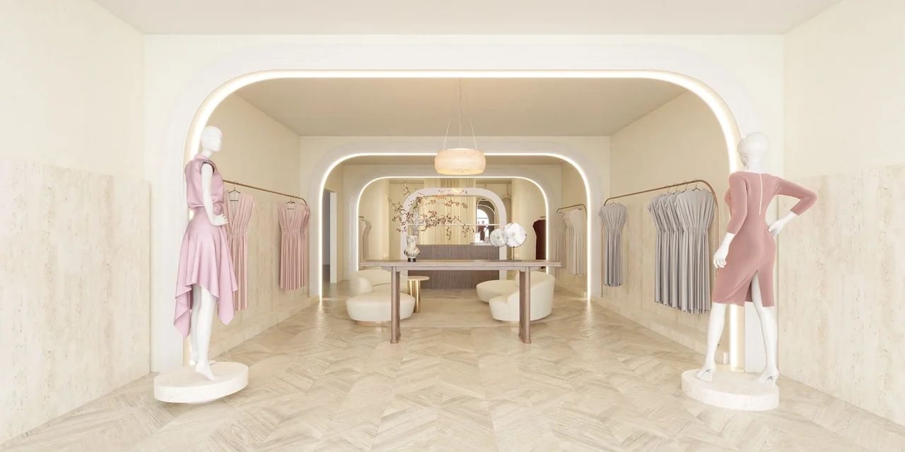 The client requested a design that would soften the spacial aspect of the rented commercial space in a residential area in Dubai. The space is an elongated rectangle and therefore has a tunnel effect. The client requested two design as the spaces is made up of two rectangular plans that are connected with a common door. The concept was to use geometric shapes to break up the length as well as stations.The first design shows a gypsum ribbed along the space that fragments it into smaller sections from the top. The second option shows island that are organically shaped on the ground and carry display rods. The client requested a minimal light toned feel with a neoclassic feel and the design plays on the neoclassical while offering a contemporary twist. The use of raw materials such a polished concrete poured floor and travertine walls gives it an industrial feel while keeping the chic edge of a retail fashion concept store.