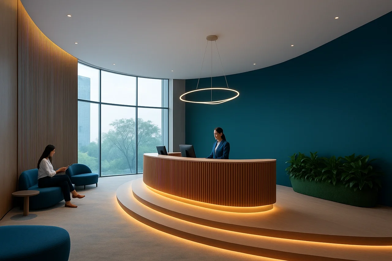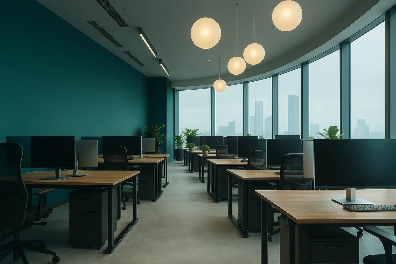 An office in Dubai, aiming to promote innovation and sustainability. The office brand has a teal blue color emphasis, which has been integrated into the design. The brief required the design to have a contemporary and futuristic feel in order to inspire the staff. Some of the required programs include individual offices, break rooms, meeting, rooms, and Green integration.