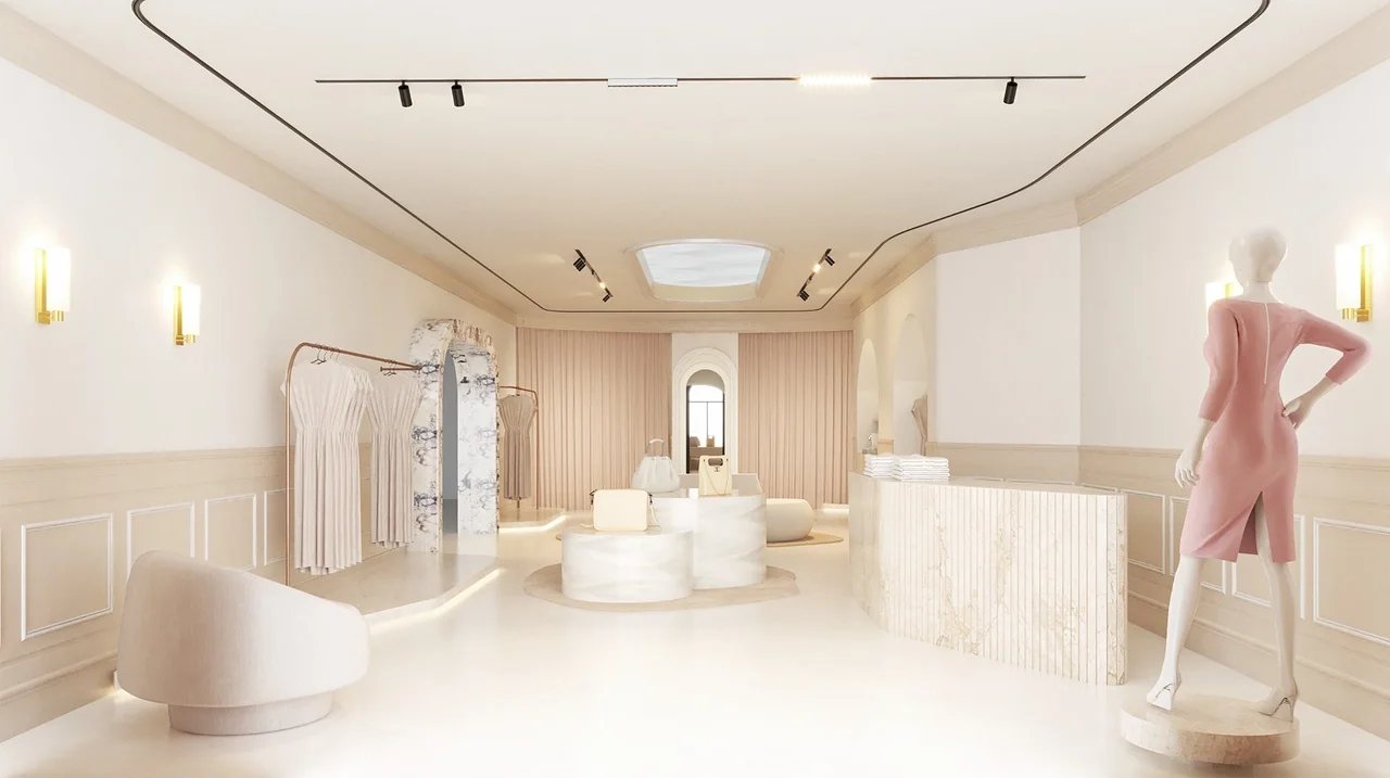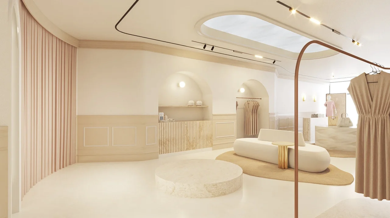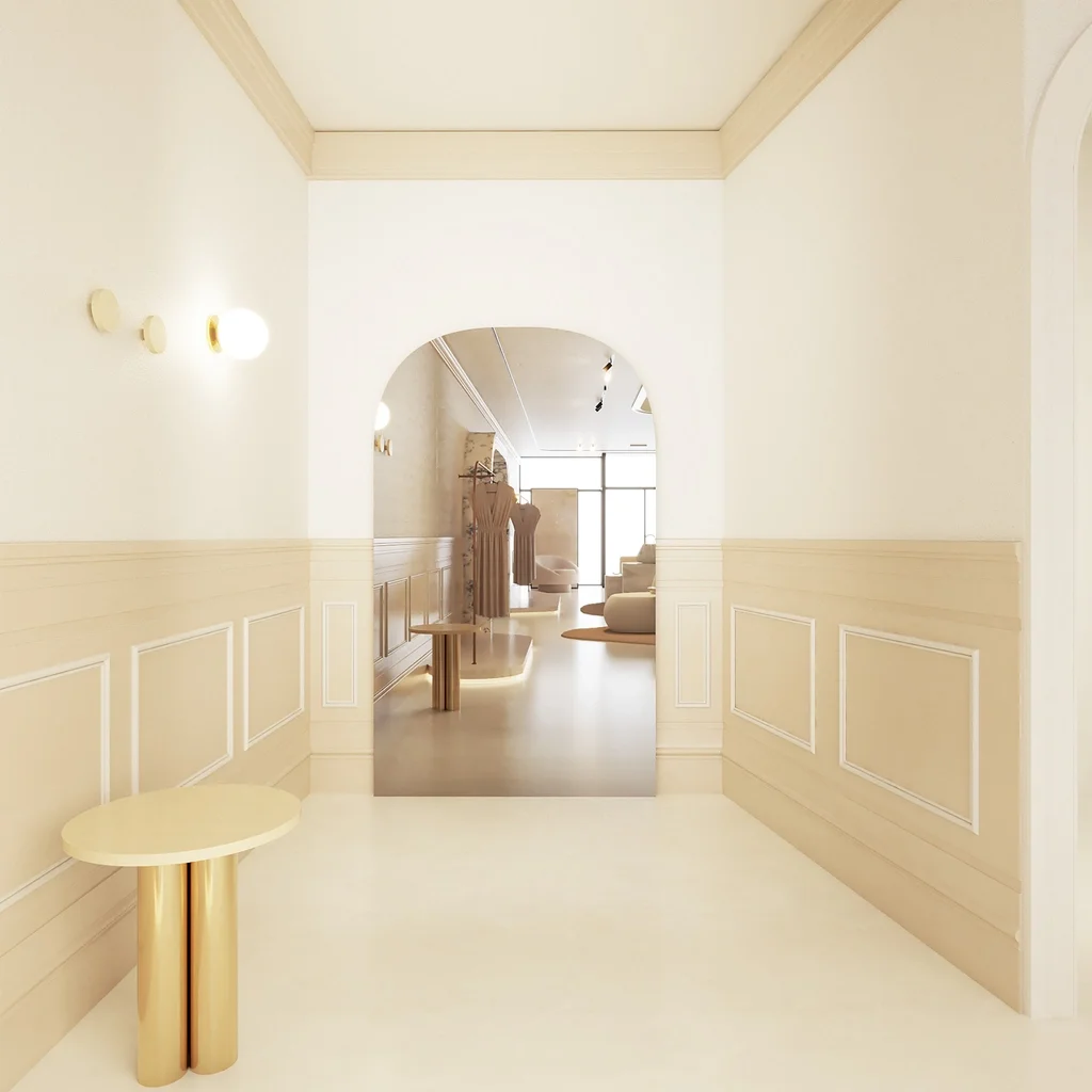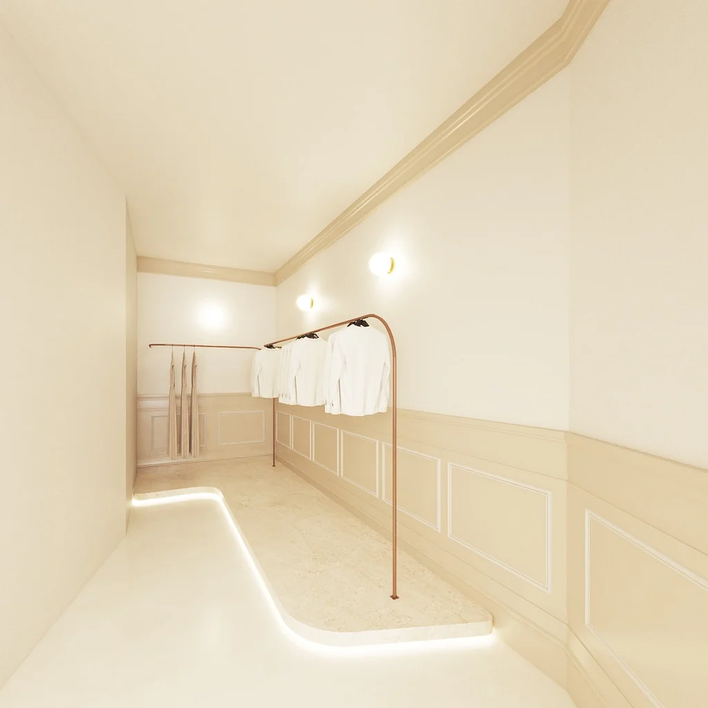 The client requested a design that would soften the spacial aspect of the rented commercial space in a residential area in Dubai. The space is an elongated rectangle and therefore has a tunnel effect. The client requested two design as the spaces is made up of two rectangular plans that are connected with a common door. The concept was to use geometric shapes to break up the length as well as stations.The first design shows a gypsum ribbed along the space that fragments it into smaller sections from the top. The second option shows island that are organically shaped on the ground and carry display rods. The client requested a minimal light toned feel with a neoclassic feel and the design plays on the neoclassical while offering a contemporary twist. The use of raw materials such a polished concrete poured floor and travertine walls gives it an industrial feel while keeping the chic edge of a retail fashion concept store.