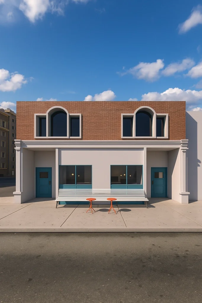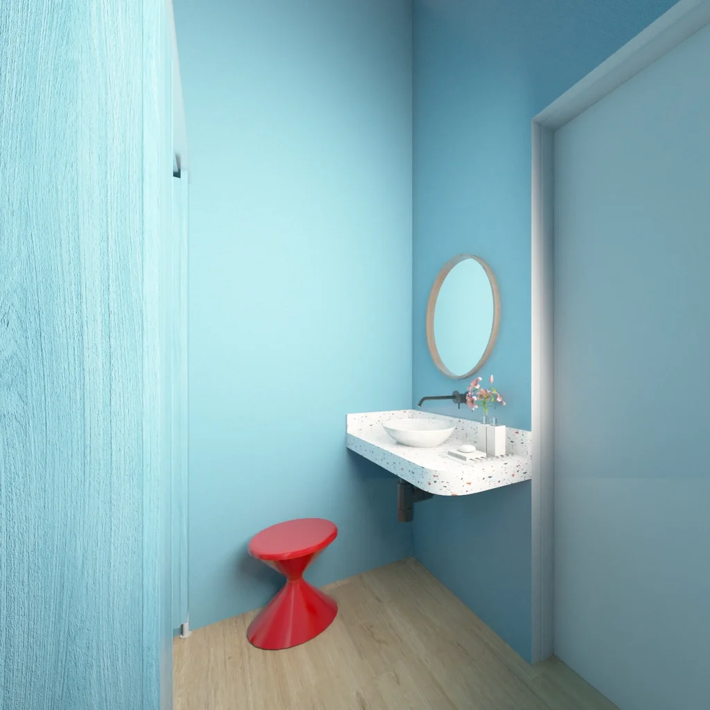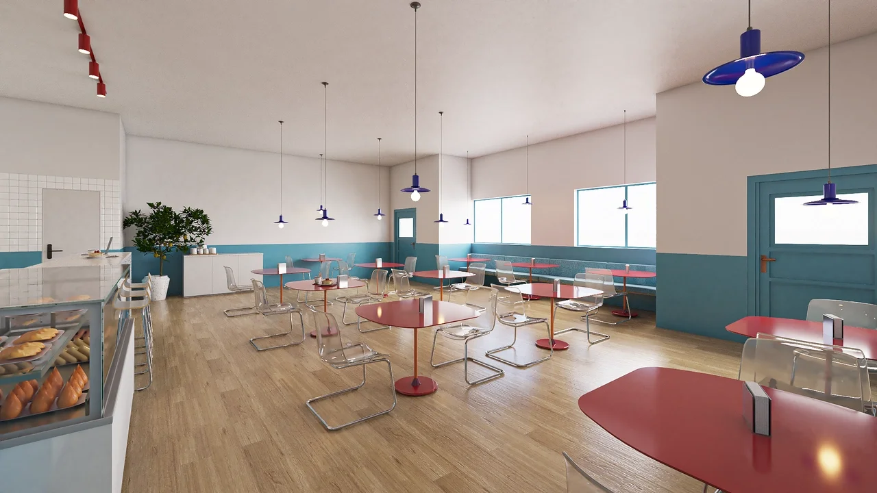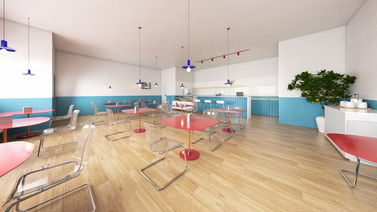 The client requested an interior design for a cafe in a residential area in london. The cafe is on the ground floor of a brick building under renovation. The look and feel requested were a bright and uplifting feel using primary colors. The design concept is based on freeing up the central space of the cafe in order to allow for different configurations as well as using brightly colored tables while leaving the chair translucent mixing a feeling of curiosity with a refined but pop of red. The walls are half painted with a powder blue which match the facade louvres therefore creating a playful feel. The bar is at the back and flanked by a wc and a storage area.