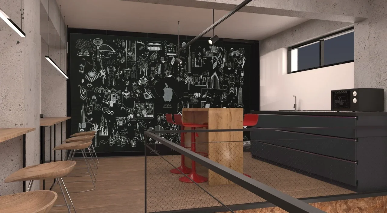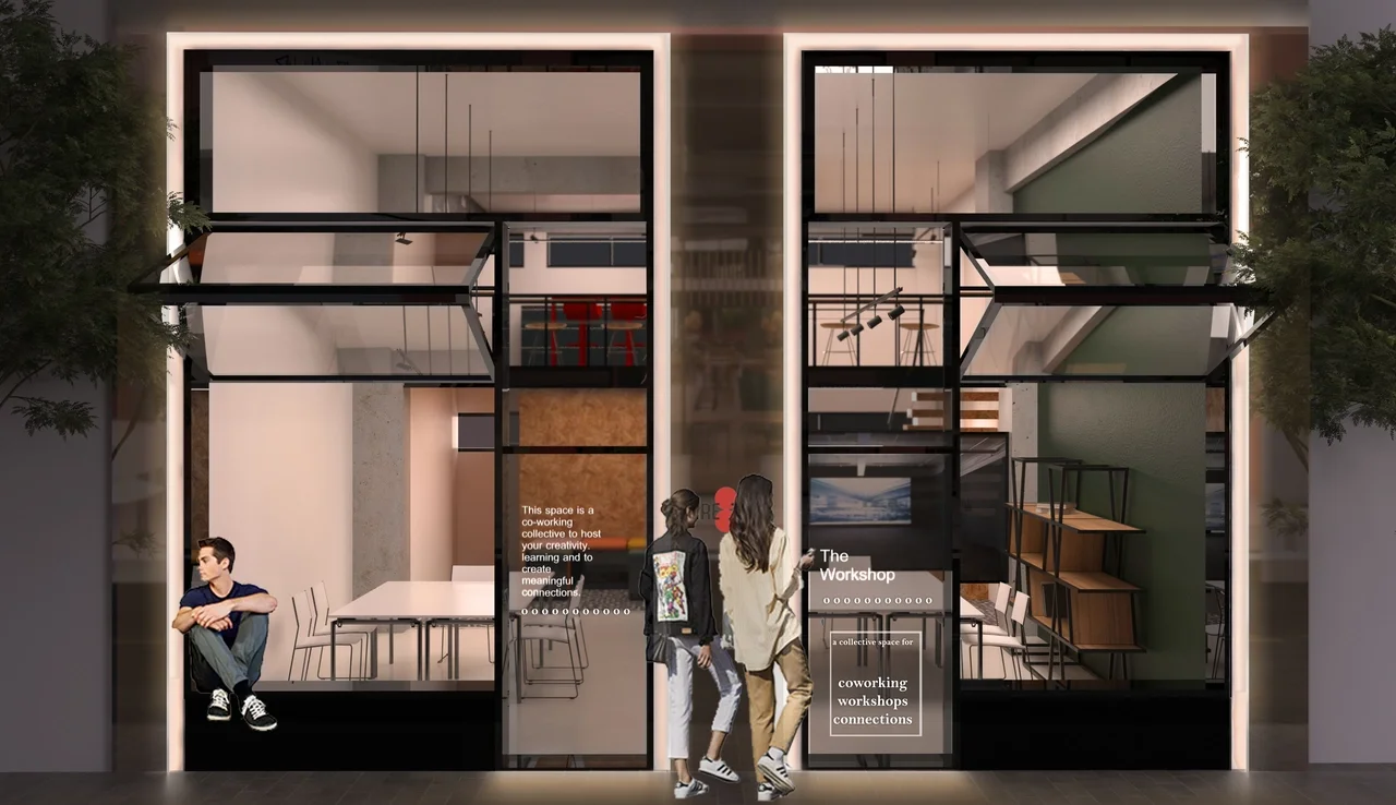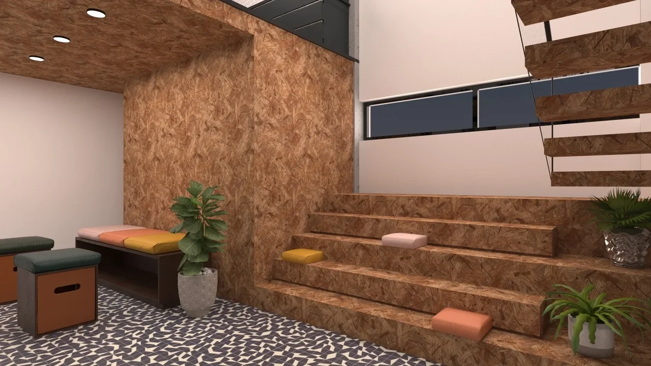 The hive is a co-working space and functions as an extension to the Cohort hotel in Athens. Across the street from the hotel, its proximity enlivens the area and creates an urban street connection. The design brief was to design a multi-use space. Flexibility and options for multi-use is of primal importance. The program is experimental and as such the operators require the flexibility to learn what works best. The space comprises of two levels, the ground floor and a mezzanine. The ground floor has a double height space which functions as working area with stackable and foldable furniture that can be re-arranged depending on whether there is a seminar, lecture or a regular working day. The storage room when vacant functions as a private calls area. The area under the mezzanine is transformed into a mini-amphitheater which is connected to the stairs to the mezzanine visually using the same cladding OSB wood. The mini amphitheater is also a double height area to relieve the space.
