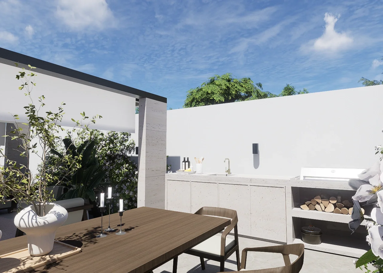 The client requires an openness and minimal design to allow for easy circulation while creating an elegant feel. The entrance zone is to have the parking and pergola and bbq areas in order to receive guests. The landscape proposal is to have a green corridor that has paving and leads to the back yard which is a private dining and playing area.